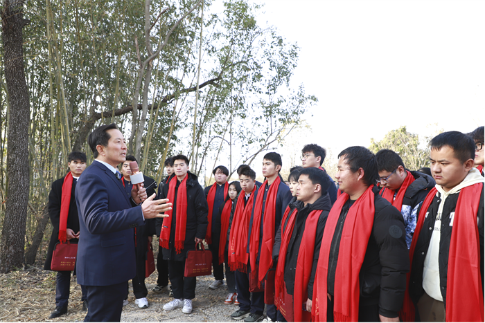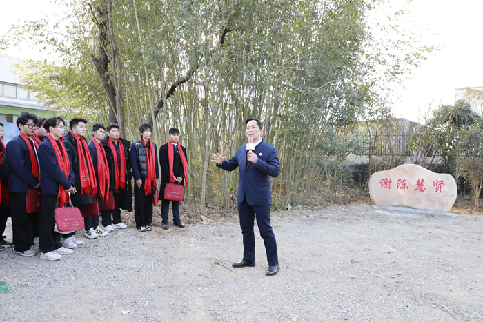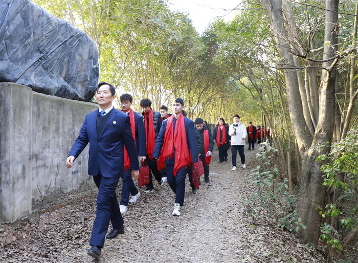 同学们继续深入山野,沿着小路漫行,穿过创业地旧址长廊处,陈孝云又以个人创业经历重新为同学诠释了“赢”的含义。
