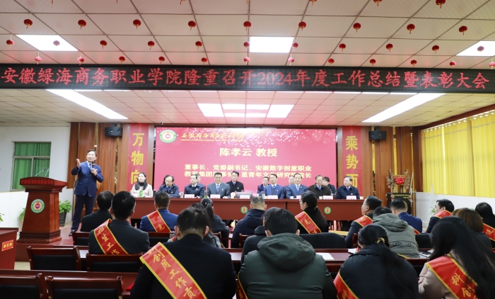 学校董事长、党委副书记、星青年文化研究院院长、安徽数字创意职业教育集团理事长陈孝云教授作总结讲话。他首先代表学校董事会、党政领导班子对2024年度学校各方面工作成效给予充分肯定,向爱岗爱校、辛勤付出且成果显著的全体教职员工致以最诚挚的问候和最美好的祝福,向受到表彰的先进单位和个人表示热烈的祝贺。他指出,在刚刚过去的一年里,学校深入学习贯彻习近平总书记关于教育的重要论述和全国教育大会精神,深入贯彻党的教育方针,坚持社会主义办学方向,全面加强党的领导,全面落实立德树人根本任务,以高水平党建引领学校各项重点任务的有序推进,注重在提升思政引领力、人才竞争力、科技支撑力、民生保障力、社会协同力、国际影响力上下功夫,圆满完成了全年各项目标任务,展现了绿海蓬勃的发展态势和强劲的发展潜力。