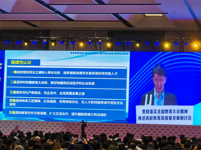 会上,吴岩强调,2025年,职业教育战线要以“落实”为主题,深入学习贯彻全国教育大会精神。一是要“立框架”,系统推进职业教育体系建设改革,特别是要从学校层面推进“一体两翼”建设。二是要“练内功”,围绕职业教育“101计划”,各学校要做好职业教育“新基建”,打造一流的专业、课程、师资、教材、实习实训基地。三是要“树标杆”,做好新一轮“双高计划”建设,实现从原来的“基础好、条件好”,转向“服务好、支撑好”。四是要“扩影响”,研制标准,有序地推进“职教出海”,持续扩大职业教育国际影响力。五是要“保安全”,要切实做好职业院校安全稳定工作,确保“万无一失”。吴岩部长还表示,作为高职院校的校长书记要有五种能力,政治家的素质、教育家的精神、企业家的敏锐、外交家的眼光和艺术家的技艺。