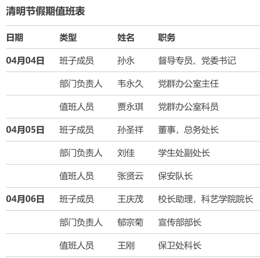 2025年清明节(4月4日-4月6日)值班安排表