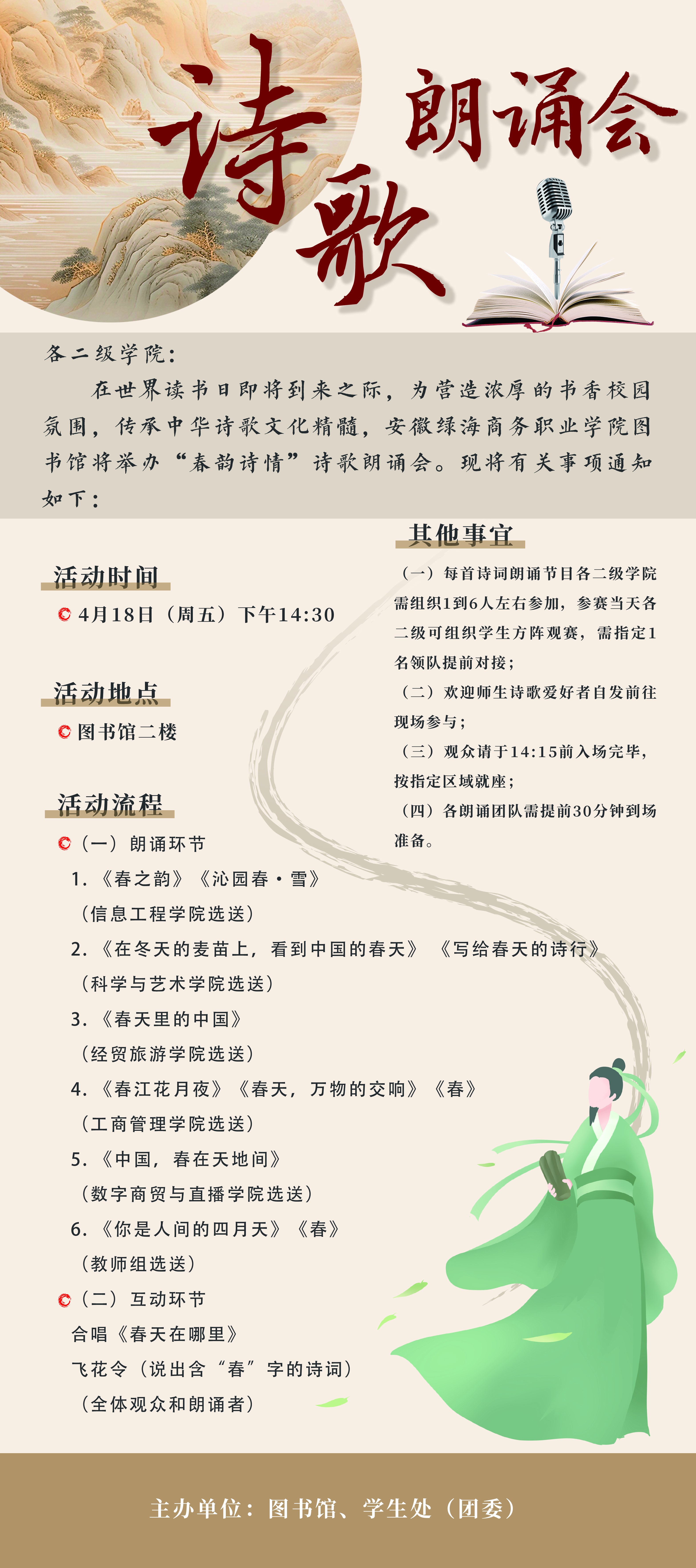 为响应4月23日世界读书日,营造书香校园文化氛围,传承中华诗歌文化精髓,绿海商务学院图书馆特举办"春韵诗情"诗歌朗诵会。现将有关事项通知如下: