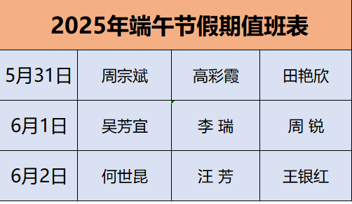 2025年五一劳动节(5月1日-5月5日)值班安排表