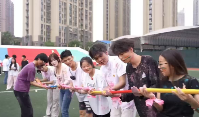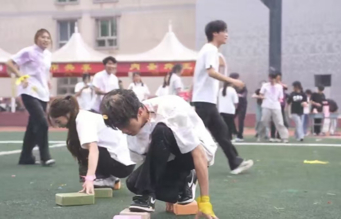 活动吸引数百名学生踊跃参与,选手经随机分组组成7支队伍,涵盖各二级学院及学生社团。区别于传统跑步活动,本届“智力彩虹跑”将体能挑战与智力比拼深度融合,由经贸旅游学院、科学与艺术学院等五个二级学院及学生组织分别设计特色关卡,包含双人跳绳、你画我猜、两人三足、抒情颂词猜歌名等趣味项目。参赛选手需在奔跑过程中灵活应对关卡挑战,充分考验体能、技巧与应变能力。