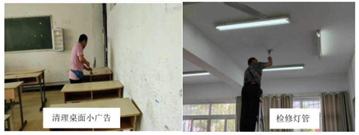 课桌椅维修、桌面墙面广告清理、灯管检修……为了排除公共区域的安全隐患,总务处对教学楼展开“地毯式”整修。力争在新学期中为师生提供更加安全、便捷、舒心的学习环境。
