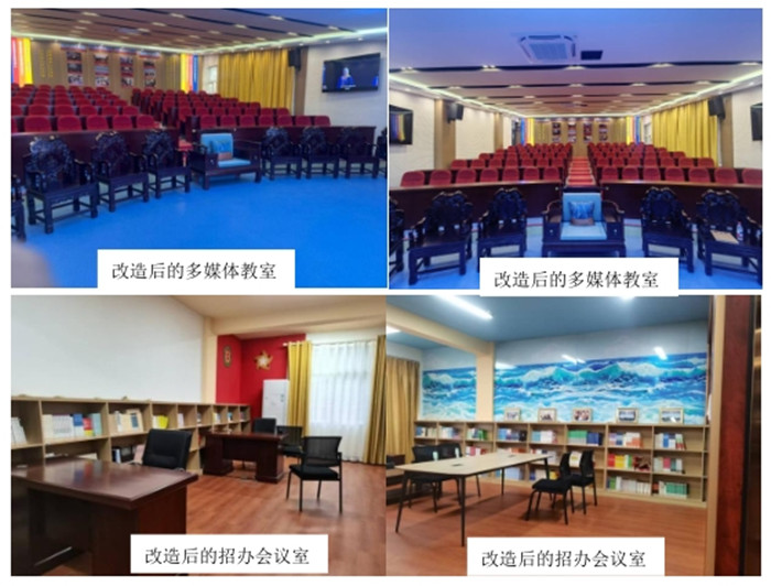 全新的招办国际会议室和阶梯教室尤为亮眼:高清空中成像大屏、智能音响、现代化装修风格,将为师生带来更高效的教学体验。