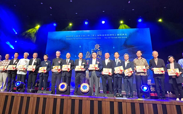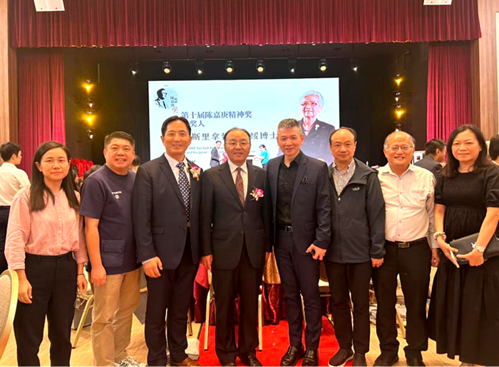(吉隆坡讯)10月11日晚,由马来西亚陈嘉庚基金会举办的“庚雨海乡·嘉生万象”嘉庚之夜暨第十届陈嘉庚精神奖颁奖典礼隆重举行。中国驻马来西亚大使欧阳玉靖出席并致辞,陈嘉庚基金会主席陈友信、副主席陈景岗,第十届陈嘉庚精神奖获奖人拉曼大学创校校长黄丽绥和华侨博物院名誉院长陈毅明等600余名各界人士参加活动。吉隆坡科技大学董事局主席陈孝云教授和大学管理团队代表受邀出席。陈孝云主席应邀与欧阳玉靖大使、陈友信主席等嘉宾共同为获奖者授誉并留影纪念。