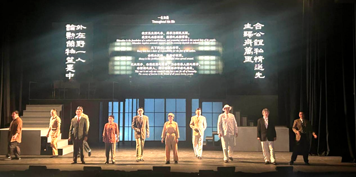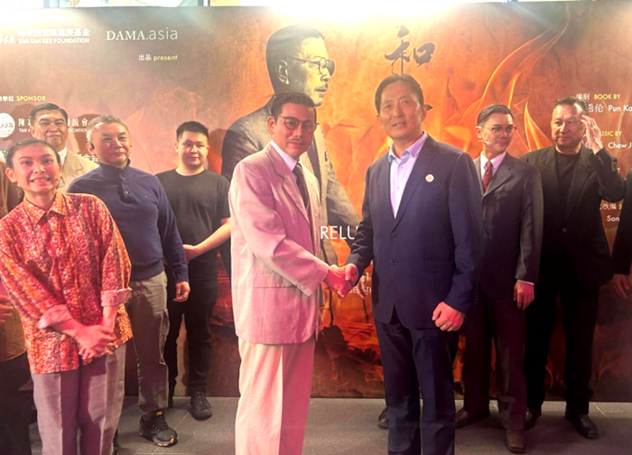 当天下午,在马拉西亚八打灵再也表演艺术中心(PJPAC)剧场,话剧《和平之路嘉庚传奇》拉开帷幕。陈孝云和吉隆坡科技大学代表团受邀观看了演出。话剧以跌宕起伏的叙事,生动刻画了爱国华侨陈嘉庚先生在艰难险阻中坚守“忠公、诚毅、勤俭、创新”的精神内核。剧中重现了他倾资兴学、支援抗战的传奇经历,尤其是面对困境时展现的大国情怀与奉献精神,引得现场观众多次动容。活动接近尾声时,陈孝云与陈嘉庚扮演者亲切合影、交谈。