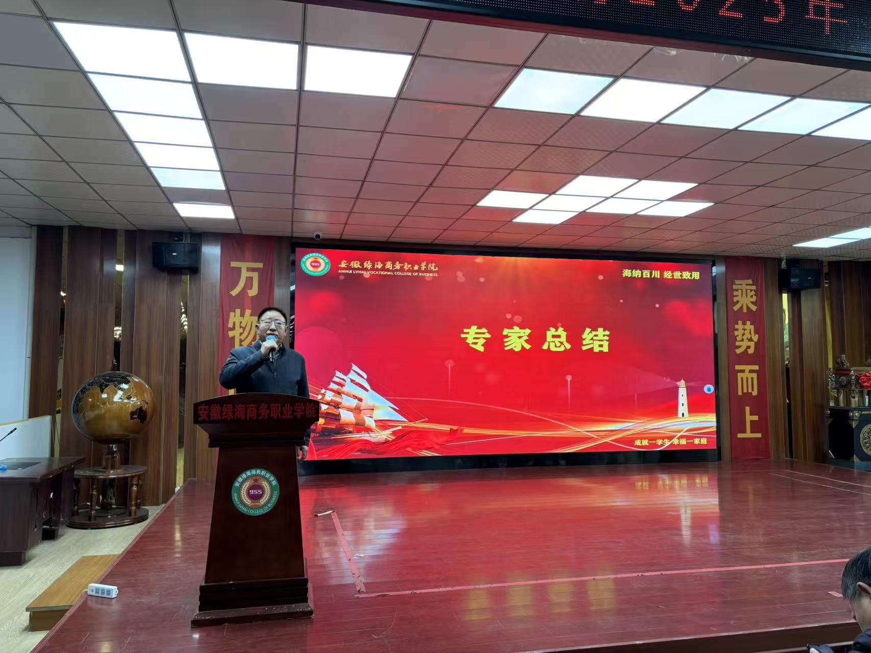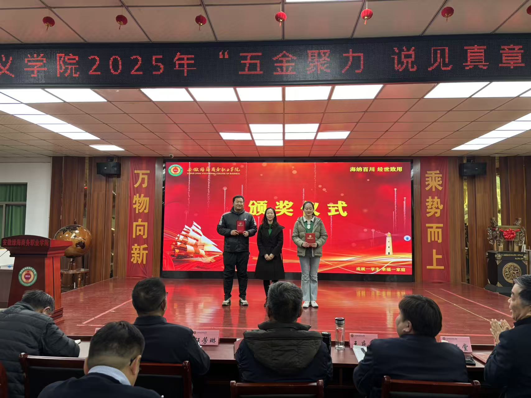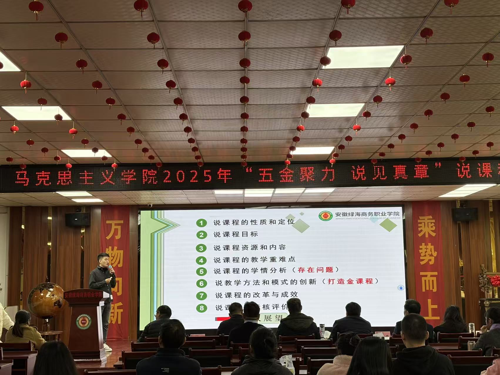 为深入贯彻落实学校教师队伍建设要求,助力学校“五金”建设发展战略,全面提升教师教学能力和专业素养,推动教学理念与方法创新。在教务处统一部署下、在学院专家团队的指导下,11月27日下午,马克思主义学院在图书馆二楼隆重举办2025年“五金聚力・说见真章”说课程比赛活动。学校相关职能部门负责人、马克思主义学院全体教师及部分师生代表到场观摩。校长助理、信息工程学院院长郭玉堂,校长助理、科学与艺术学院院长王庆茂,校长助理、信息工程学院副院长吴芳宜,教务长、数字商贸与直播学院院长姚如富,经贸旅游学院院长汪芳琳,工商管理学院院长陆新文,科研处处长陈辉、信息中心主任许乐灵等专家教授亲临现场指导。马克思主义学院院长喻小红、党支部副书记王俊及全体教师共同观摩学习。