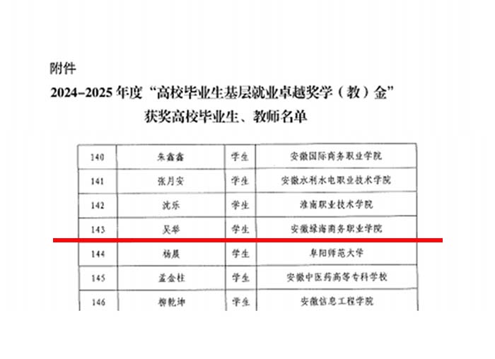 “高校毕业生基层就业卓越奖学(教)金”由教育部高校学生司(高校毕业生就业服务司)、教育部学生服务与素质发展中心共同指导,中国长江三峡集团有限公司出资,中国教育发展基金会特设,奖励赴基层就业并做出突出业绩的普通高校毕业生,以及指导服务大学生赴基层就业工作有突出贡献的教师,具有极高的权威性与影响力。2024—2025年度“高校毕业生基层就业卓越奖学(教)金”共奖励学生418人、教师58人。其中安徽17名学生,3名教师入选。
