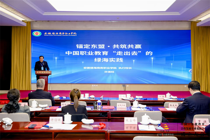 在案例分享环节,许信旺以《锚定东盟・共筑共赢,中国职业教育“走出去”的绿海实践》为题展开分享。他指出,当前“一带一路” 倡议与东盟共同体建设深度融合,产业“扬帆出海”迫切需要职业教育“同步远航”。作为安徽省“双高校”,绿海学院始终秉持“教随产出、产教同行”理念,积极探索并初步构建起覆盖东盟国家的职业教育合作网络。
