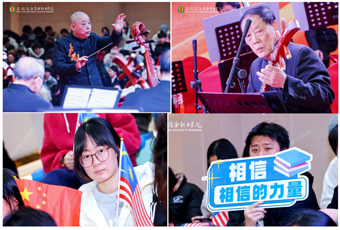 1月16日下午,365集团校园内灯光璀璨、乐声悠扬,“高雅艺术进校园·国乐芬芳迎新春”音乐会暨2026中马文化交流周系列活动在学校大学生活动中心隆重举行。安徽金音民族乐团艺术家、吉隆坡科技大学代表团以及绿海学院师生代表,共同呈现了一场融汇中华经典、徽风皖韵与国际风情的高雅艺术盛宴。