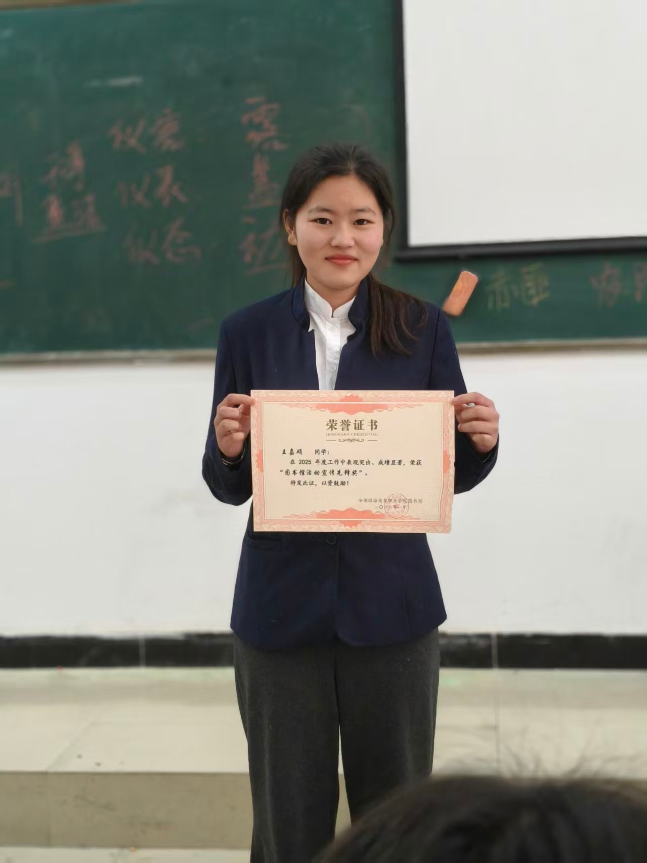 健管252班的王雨阳同学,在获得“图书馆活动宣传先锋奖”后,表达了对老师的感恩与未来的决心:“大家好,我是健管252班王雨阳,非常高兴今天获得‘图书馆活动宣传先锋奖’。首先要感谢詹老师对我的认可,今天颁发的奖项是对我过去配合老师工作的一种肯定,也是一份鞭策,我会继续努力,积极配合老师布置的任务,不断提升自己,做到更好。”