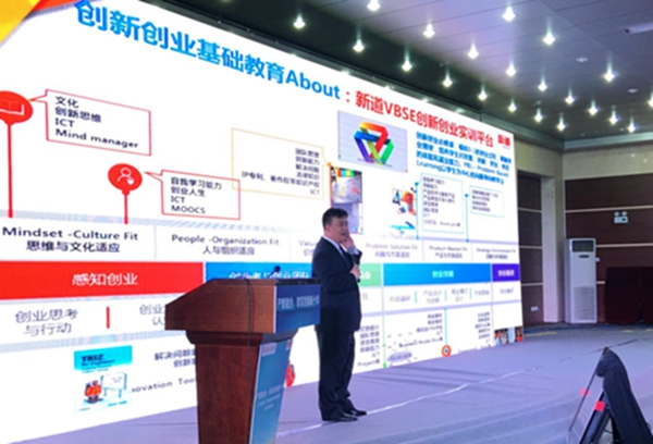 演讲嘉宾从不同视角论述了创新创业教育与商科实践教学的落地与发展。新道科技股份有限公司高级副总裁周前进在主题演讲中指出:“我们认为创新创业教育改革可以分为几部分:第一部分是文化氛围层面,主要形式可以通过创新创业成果展示,讲座等方式实现;第二部分是创新创业教育,修改人才培养方案,以必修课或选修课的方式进入正式学习(课堂教学);第三部分是创新创业模拟与实践,以创新创业项目训练营、第二课堂和创新大赛等形式开展;第四部分是通过融资路演企业化运营。只有融合才能共赢发展,和新道的融合也意味着和全球260万家企业和2700所院校的融合。