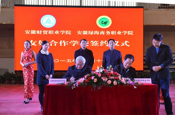 安徽省教育厅副厅长解平、省教育厅原总督学、安徽三联学院督导专员、党委书记李明阳、省教育厅职业与成人教育处处长朱彤、省教育厅民办教育处处长张尔桂、省教育厅高等教育处副处长童兆胜等出席了签约仪式。解平、李明阳共同为“友好合作学校”揭牌。