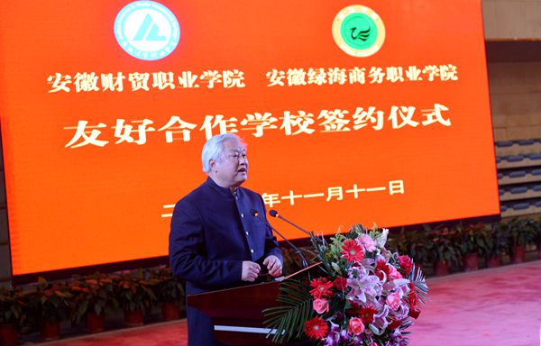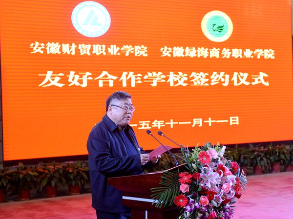 许崇正在讲话中指出,高职教育领域的友好合作是贯彻落实安徽省教育厅职业教育方针政策的具体行动,是推进绿海学院办学模式和人才培养模式改革、提高教育教学质量的有效途径。安徽财贸职业学院作为我省高职教育的一面旗帜,“大手拉小手”带动绿海学院同步发展,希望能够互通互融,学习借鉴财贸学院办学经验成果,为绿海学院在新的转型阶段实现“一体两翼”战略发展规划和“985”发展目标而努力。