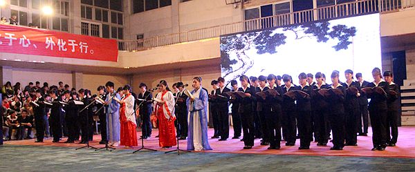 率先出场的代表队,在古筝的伴奏下,同学们齐声诵读《弟子规》,意境深远。“慈母手中线,游子身上衣。临行密密缝,意恐迟迟归。谁言寸草心,报得三春晖”。《游子吟》感人肺腑的场景告诉我们,莫要等到树欲静而心不止,子欲养而亲不待,才后悔没能尽到孝心;“爱我中华,传承经典”,响亮的口号在体育馆响起,接着出场的是旅游系的同学们,“记得吗,你祖先的名字叫炎黄?”提醒现代青年不忘祖先,树立文化自信。吟诵穿插,在“泛爱众”部分,用吟唱的形式表达,使整个现场气氛达到高潮;大军压境,两军争霸,仁孝在心头,忠义不敢丢,少年岳飞,精忠报国,诵读经典,忠孝仁义,作为压轴的信息系同学,随着口号,缓缓呈“义”字散开,与众不同的是,他们实行传统礼仪中的坐礼,这是一个大胆的决定,也是万花从中一点绿,响亮的诵读,默契的配合,使他们在过程中游刃有余,一曲终了,顶礼经典……