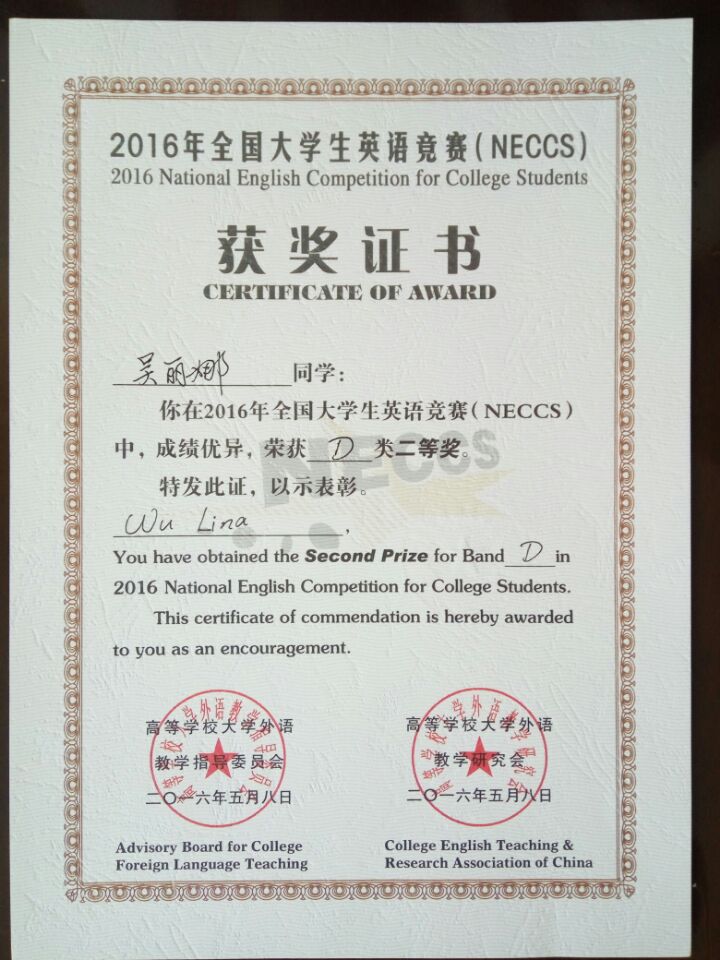 近日,从全国大学生英语竞赛组委会传来喜讯,365集团院三名学生获2016年全国大学生英语竞赛(NECCS)D类(高职高专非英语专业学生和艺体类本科生)二、三等奖。