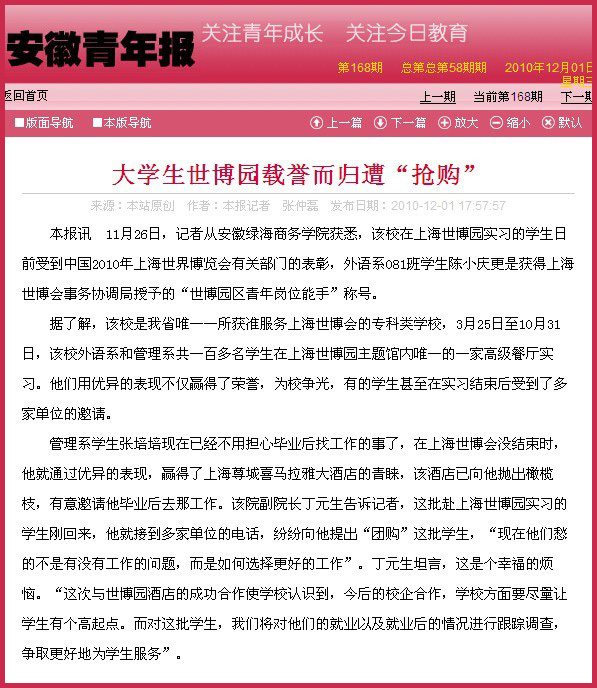 安徽青年报《大学生世博园载誉而归遭“抢购”》