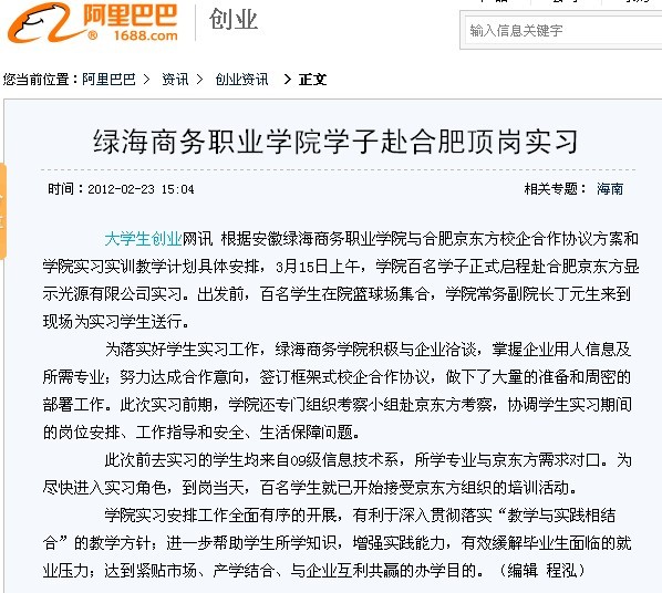 阿里巴巴——绿海商务职业学院学子赴合肥顶岗实习