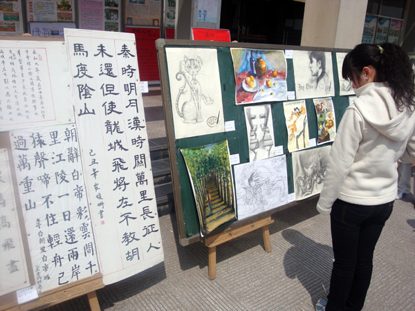 一张张墨图折射出阳光的影子,大多数绘画作品并没有鲜艳的色彩,但这些作品中描绘的树木、水果、花瓶却另有一番意境,与众不同的绘画风格吸引了许多同学驻足欣赏。一篇篇令人赏心悦目的软笔书法更是令在场同学叹为观止,其字迹正如苏轼所说,大略如行云流水,初无定质,但常行于所当行,止于所不可不止。这些优秀的作品顿时让绿海的校园内弥漫出浓浓的艺术气息,也使同学们对书法、绘画艺术产生了浓厚的兴趣。