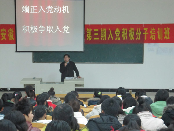 祝书记的报告共分六个部分,历时两个钟头。他结合长期的党务工作实际,深入分析了当前大学生入党动机的种种表现及其产生的原因,并要求本期全体学员要按照端正入党动机的途径和方法去做,树立正确的入党动机,时刻以一名大学生党员标准严格要求自己,以实际行动积极争取入党。