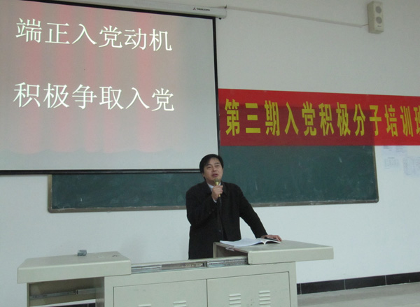 本网讯 12月4日晚,我院党校第三期入党积极分子培训班在第二教学楼第八阶梯教室举行第三场党课报告会。省政府督导专员、学院党总支书记、院党校校长祝吉太同志在报告会上为学员们作了“端正入党动机 争取早日入党”报告,学员们的心灵又一次受到了党的知识的洗礼。报告会由培训班班主任张传东老师主持。