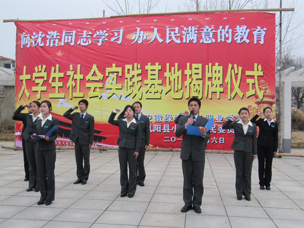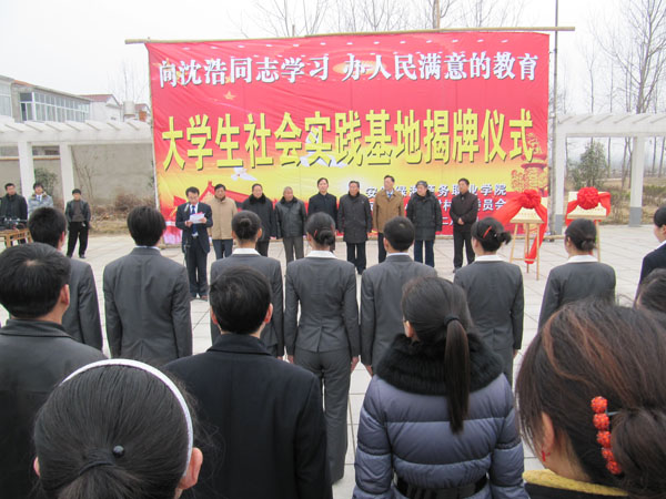 连日来,我院在广大师生中广泛开展学习沈浩事迹、倡导沈浩精神,用实际行动践行科学发展观活动。为了进一步深入学习沈浩精神,2月6日上午,我院大学生社会实践基地和大学生思想政治教育基地落户凤阳县小岗村。学院董事长陈孝云、院长石秀和、副院长孙太清、小岗村党支部副书记张秀华、大包干带头人严立学、关友江和小岗村荣誉村民、省文联委员、省报告文学学会会长温跃渊等领导同志出席了揭牌仪式,仪式由我院副院长宋凡主持,部分师生参加了上述活动。