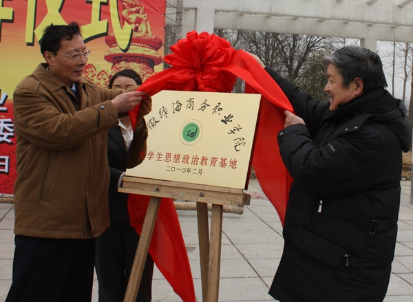 绿海学院院长石秀和(左)与省报告文学学会会长温跃渊为大学生思想政治教育基地共同揭牌