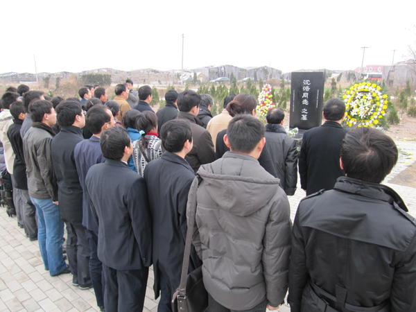 在沈浩墓地前,我院举行了庄重的凭吊仪式。师生代表首先向沈浩同志敬献鲜花扎成的花篮,摆放在他的墓前。陈董事长和石院长上前轻轻整理花篮缎带。缎带上写着“深切缅怀沈浩同志”。全体人员肃立,向沈浩同志三鞠躬。