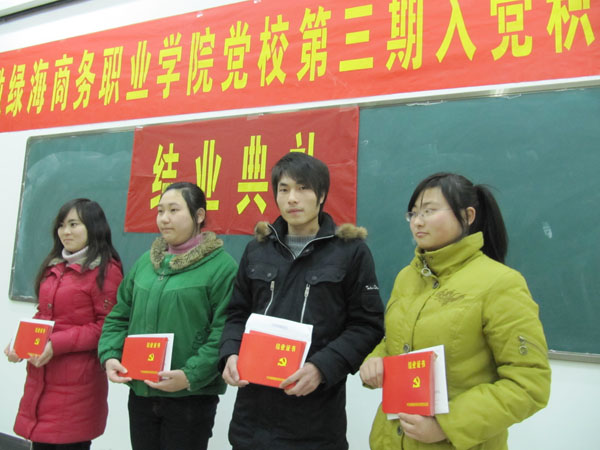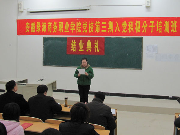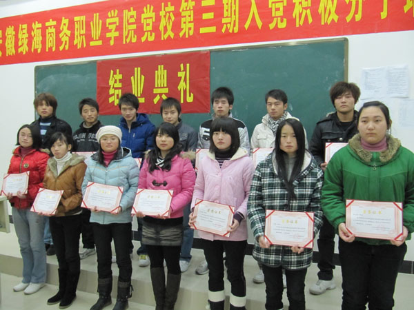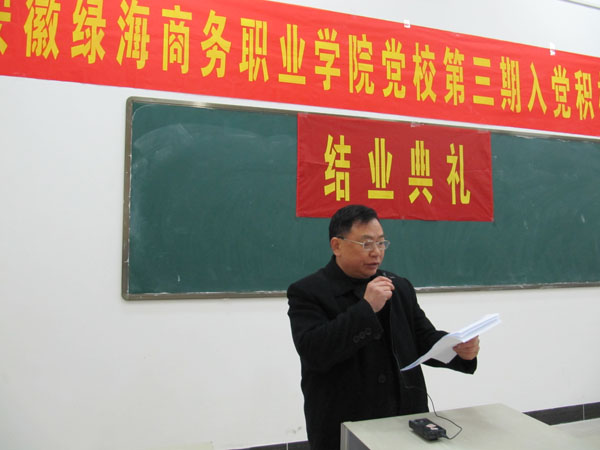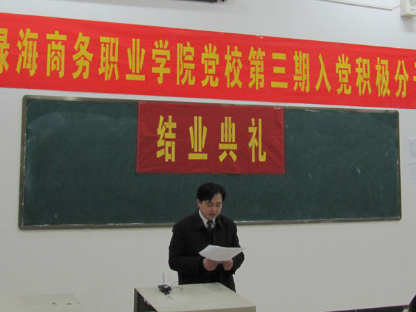 2010年1月5日晚,我院党校第三期入党积极分子培训班结业典礼在第八阶梯教室隆重举行。省政府派驻我院督导专员、院党总支书记、党校校长祝吉太同志,宣传部部长崔兴林同志,院党总支委员,各党支部书记及党校工作人员出席了本次结业典礼,培训班全体学员参加了典礼。典礼由储汉民同志主持。