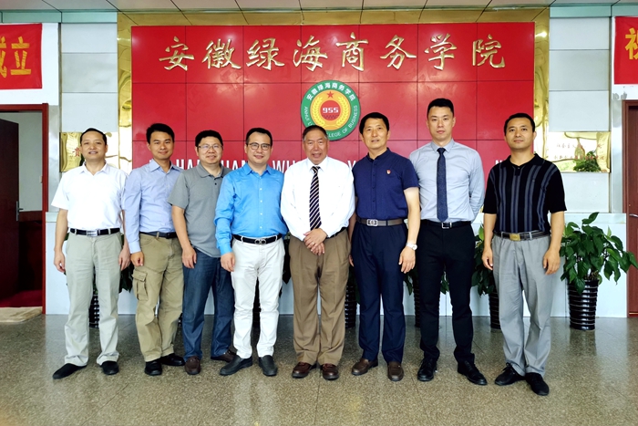 7月19日,名淘公司董事长张强率领公司总裁、犹他国际航空学院董事局主席陈剑明,副总裁付朝晖,总经理、犹他国际航空学院副总裁庄健一行来到绿海学院考察交流。在参加绿海学院航空高铁乘务学院、互联网学院、实验实训中心、星青年人才培养展示厅等场所后,陈孝云主持合作交流洽谈会。会上,陈孝云详细介绍了绿海学院的办学情况,概要介绍了合肥市城市发展战略、主要产业布局和职业教育发展情况,重点介绍了国际职教综合体项目的创意动因、规划草案以及项目建设筹备的进展情况。