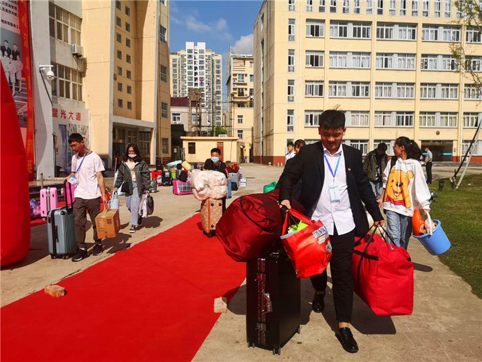 “今年比较特殊,因为疫情防控的需要,家长不能陪同入校,我非常能理解学生和家长的心情,所以要更加用心帮助他们。我们承担了更多的行李搬运工作,