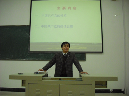 本网讯(党群办)11月10日晚,我院党校入党积极分子培训班第一讲在第五阶梯教室举行,省政府派驻我院督导专员、学院党总支书记、党校校长祝吉太同志为学员做了题为“党的性质和指导思想”的讲座,为学员上了一堂生动而富有内涵的课。