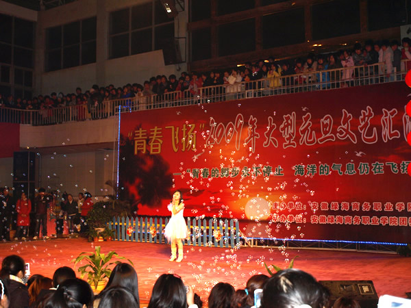 整场晚会节目异彩纷呈,高潮迭起。形式多样的节目展示出了我院大学生较高的文化艺术素养,同时也反映了我院学生丰富多彩的课余生活,体现了我院始终坚持全面发展学生的宗旨。在近两个小时的精彩演出中,绿海学院体育馆俨然变成了一片欢乐的海洋,台上台下到处洋溢着笑语。精彩的演出诠释了师生间的和谐融洽,美好的歌声表达了新年祝福。