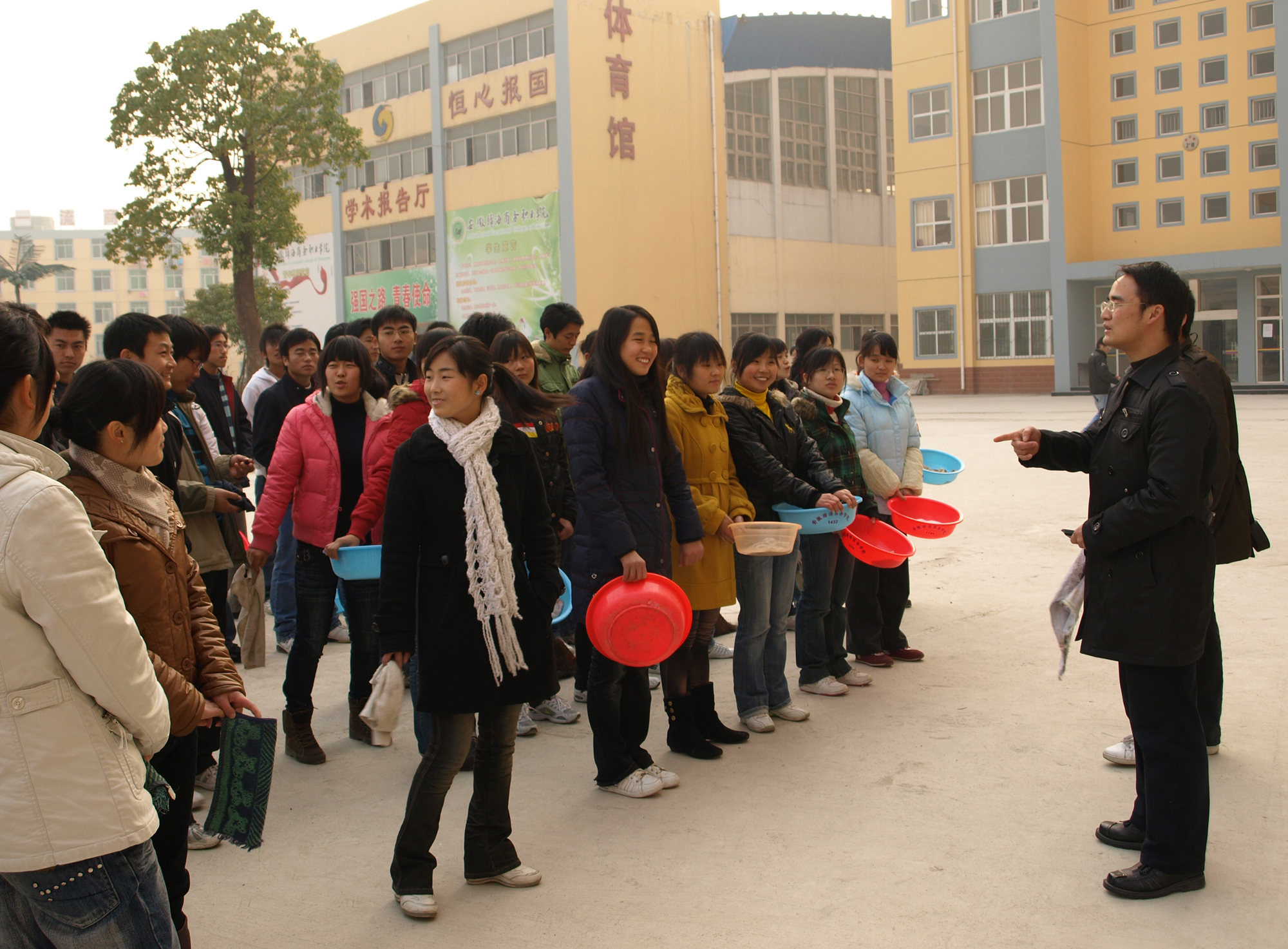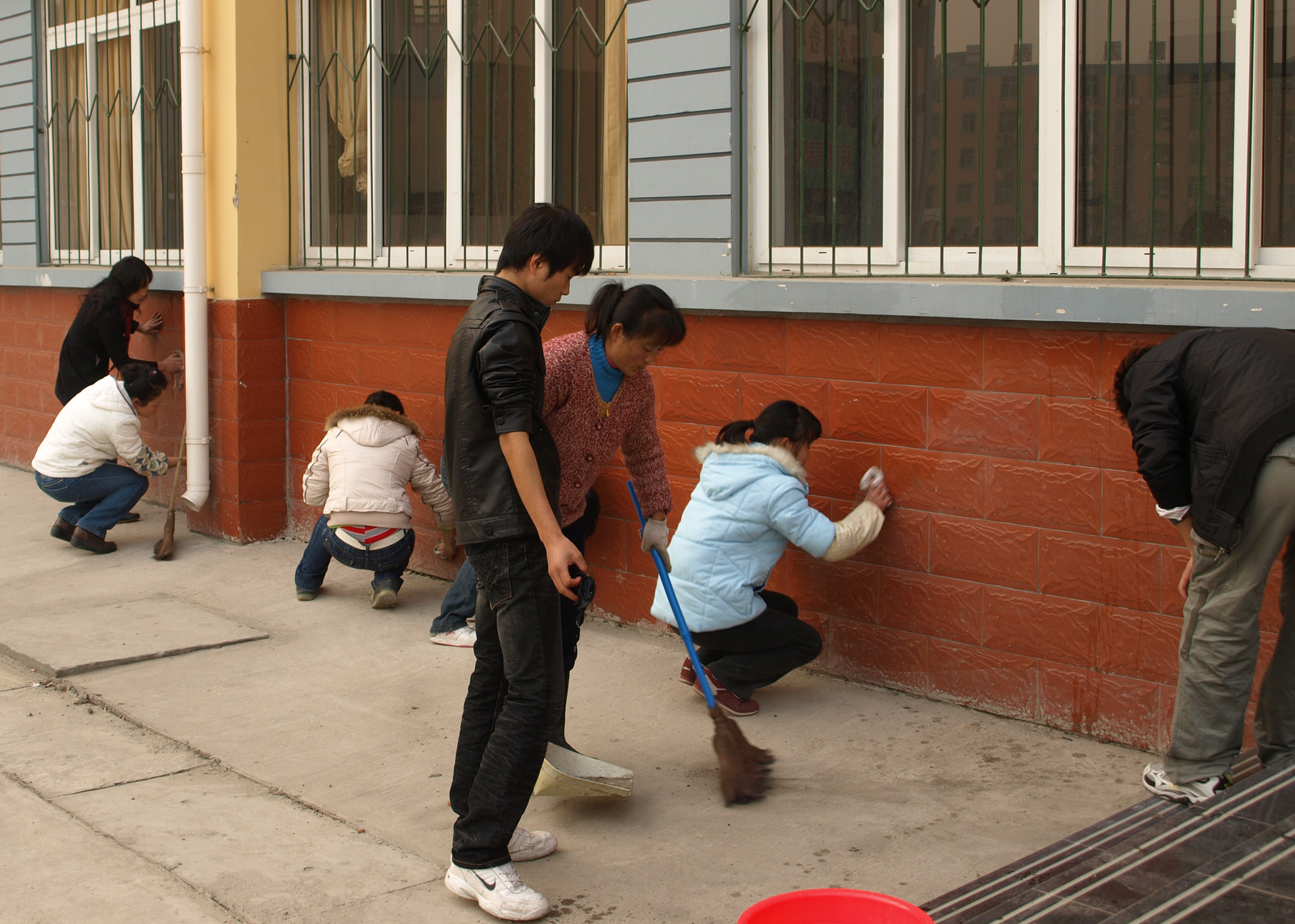 本网讯(党群办)2008年12月12日下午,我院党校组织开展第一期入党积极分子培训班学员实践活动:美化校园,从我做起。此次活动主要是擦洗新教学楼墙裙、雕塑墙裙、自动门及门柱。