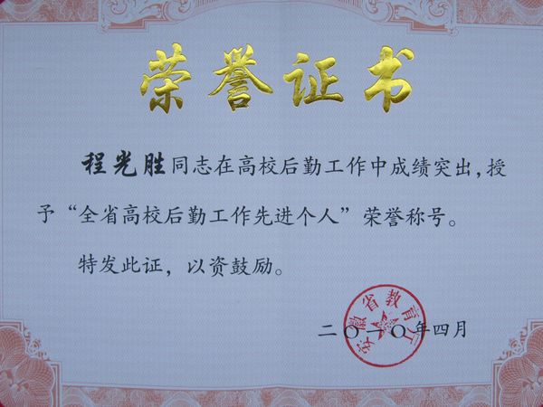我院程光胜同志荣获“全省高校后勤先进个人”荣誉称号