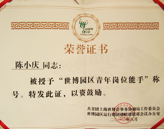 会上,我院外语系学生陈小庆同学被共青团上海世博会事物协调局授予“世博园区青年岗位能手”称号。同时她还与余盼盼同学被授予绍兴饭店世博店“青年岗位能手”称号,蔡芊芊同学被授予绍兴饭店世博店“最佳细节服务奖”称号。