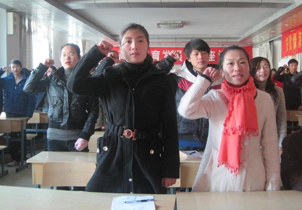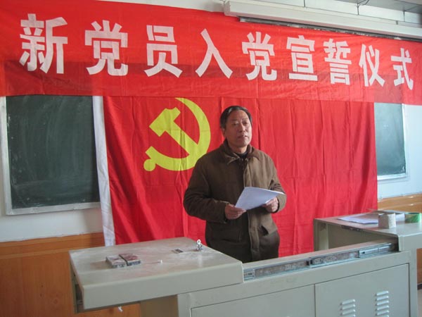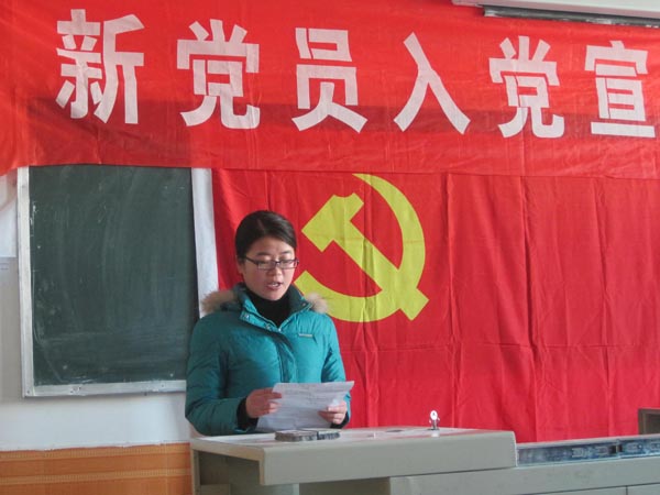 主持人储汉民带领全体新党员举起右拳,面对鲜红的党旗郑重宣誓,“我志愿加入,拥护党的纲领……永不叛党”,一字一句,神圣而凝重,表达了对党的忠诚和为共产主义事业奋斗终身的决心。外语系胡本娟同学代表全体新党员发言,表达了牢记入党誓词,决心付诸实践的心声。
