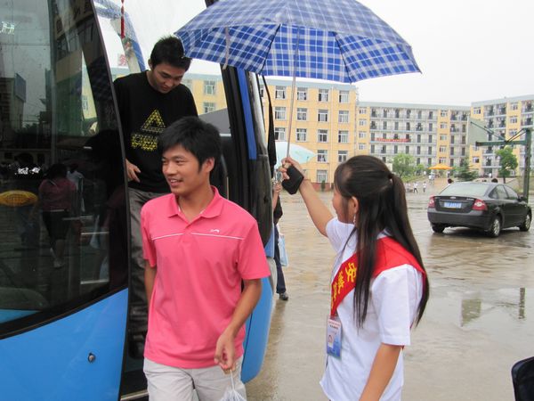 志愿者为新生撑起雨伞