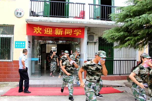 下午3时,现场指挥发出演练开始的指令,随即9号宿舍楼冒起浓烟,消防警报骤响,学生在辅导员及军训教官的指导下拿出平时备用的小毛巾迅速地用矿泉水浇湿并捂住口鼻,有秩序从楼下撤离,并按照预定的疏散路线迅速撤离到事先指定的地点整队。同时,学院保卫、辖区派出所人员在楼道、楼梯口等处加以指引、疏导,防止出现拥挤、踩踏。几分钟后,师生全部安全到达指定疏散点。
