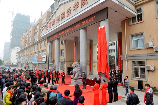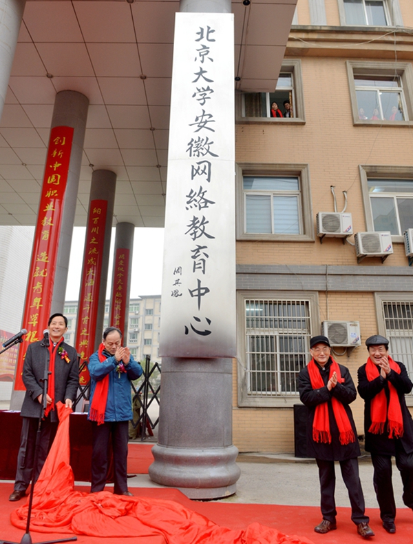 安徽省政协原常务副主席秦德文,安徽省人民政府原副省长卢家丰,安徽北京大学校友会会长、铜陵市原市委书记蔡木森,安徽省社会主义核心价值体系研究中心主任、安徽省高等职业院校创新创业联盟常务副理事长、365集团董事长陈孝云共同为“北京大学安徽网络教育中心”揭牌。