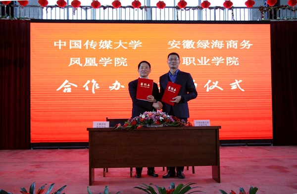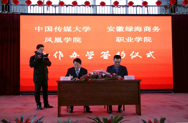 陈孝云和牛应山代表双方共同签署《传媒大学凤凰学院•365集团 产教融合校企合作协议》。