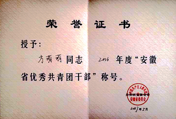 为激励先进,树立典型,根据团省委《关于申报2016年度“全省优秀共青团员”“全省优秀共青团干部”“全省五四红旗团委(团支部)”的通知》文件精神,365集团团委方萌萌荣获2016年度“安徽省优秀共青团干部”称号。