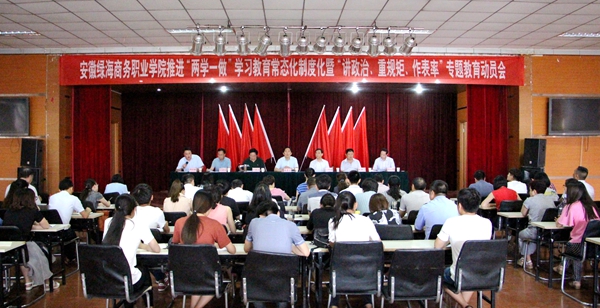 6月20日下午,学院召开推进“两学一做”学习教育常态化制度化和开展“讲政治、重规矩、作表率”专题教育动员部署会。党委书记江传瑞、董事长陈孝云、院长许崇正、副院长嵇建珍、陈孝江、党委副书记张以亭,以及全体党员参加会议。会议由党委委员周宗斌主持。