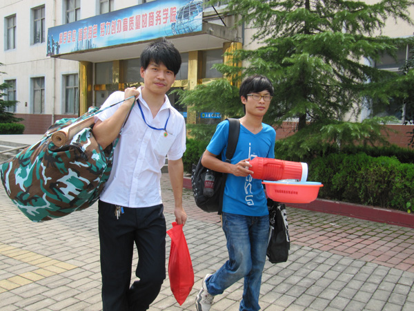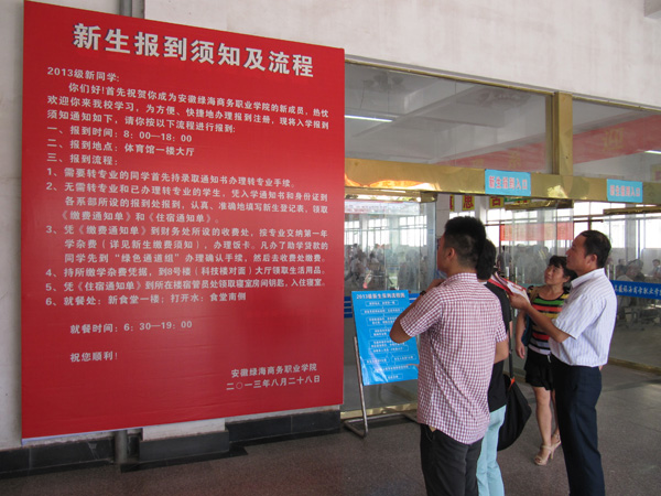 新生报到当天,校园里“欢迎2013级新同学”、“接过你的新囊,我们就是一家人”、“新生家长,您们辛苦了”等条幅随处可见;花坛和草丛中五颜六色的鲜花点缀着美丽的校园,处处洋溢着喜迎八方学子的浓烈气息;迎新现场人头攒动,秩序井然,工作人员耐心负责;校青协志愿者流动服务随处可见,大学生志愿者有问必答和有忙必帮,用美丽的微笑和真切的行动诠释学院师生对新生和家长的热情;特困生绿色通道手续简单,保障新生不因家庭经济困难而辍学,凸显人文关怀。