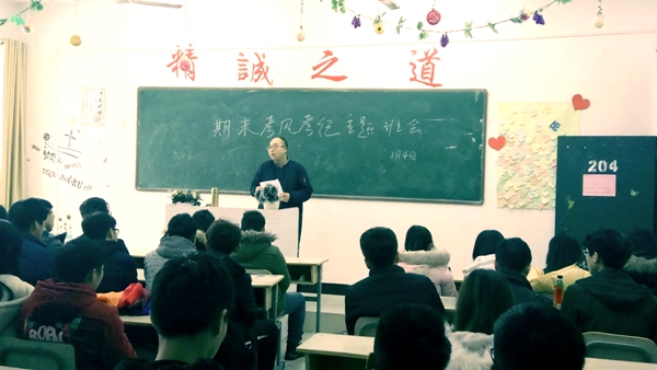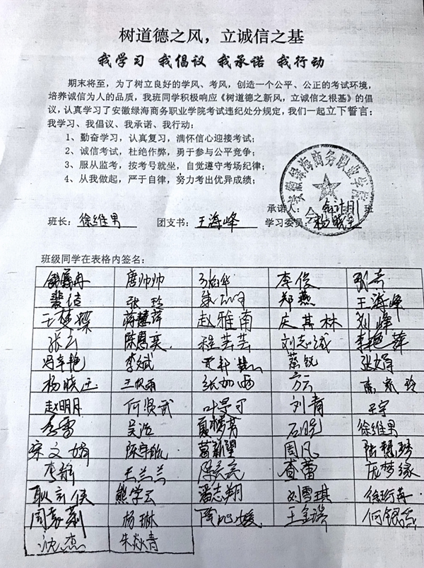 各班级召开“严肃考风考纪”主题班会,宣读《学院学籍管理实施细则》中有关考试管理规定,重申考试违纪、作弊情形后果,增强学生自律意识,全体同学签署《学院考生诚信考试承诺书》。