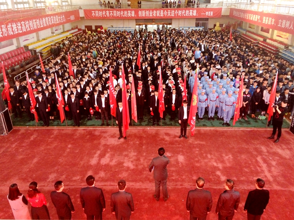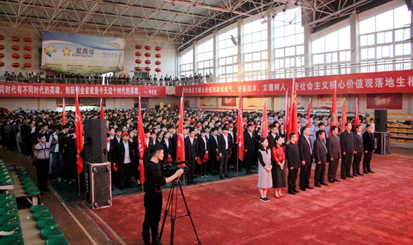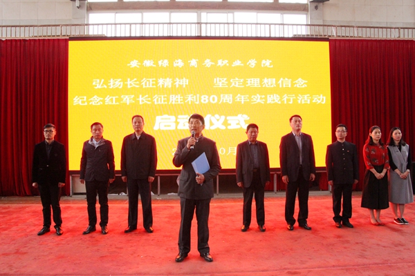 当天上午,学院在大学生活动中心隆重集会,举行“弘扬长征精神,坚定理想信念” 纪念长征胜利80周年实践行活动启动仪式。院长助理熊名文宣布此次实践行活动启动,并向团委书记朱小明授旗。