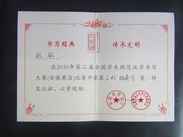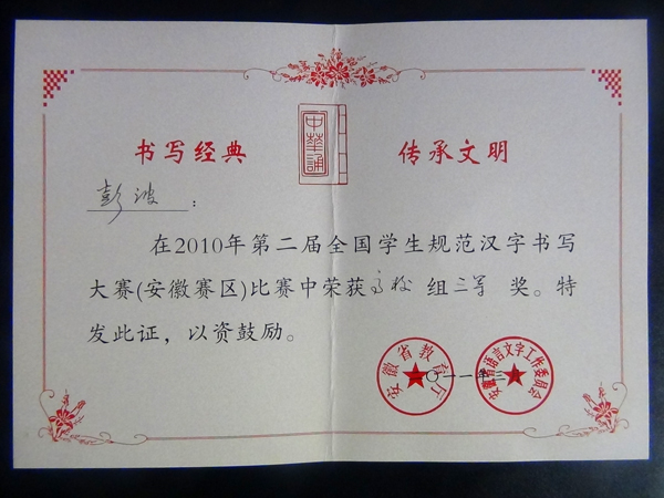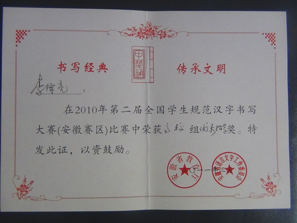 日前,我院书法协会成员程敏和彭波同学在李泽亮老师的细心指导和精心的准备下,参加了第二届全国学生规范汉字书写大赛(安徽赛区)比赛,最终双双获得了高校组三等奖的好成绩,指导老师李泽亮荣获高校组优秀指导奖。