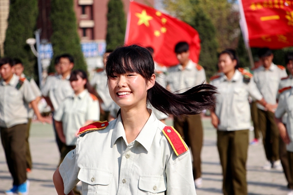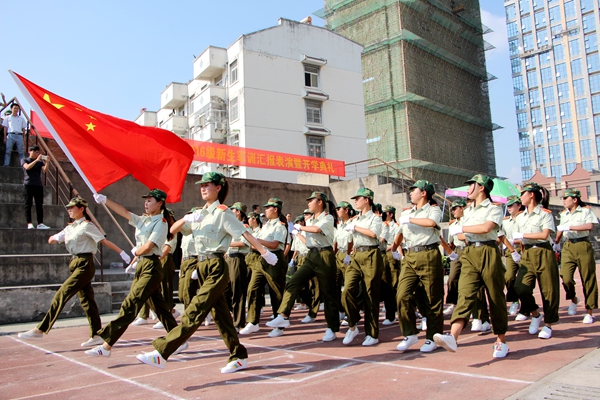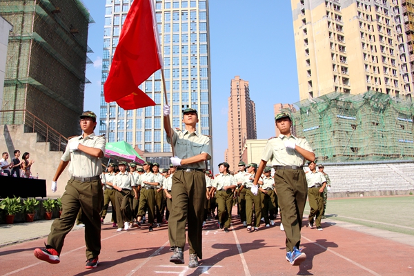 在分列式检阅中,同学们精神饱满、气势如虹,各个方阵迈着整齐的步伐昂首阔步地走过主席台,接受领导检阅。同学们阵容严整威武,铿锵有力的口号响彻绿海校园,赢得领导和嘉宾们的阵阵掌声。随后,进行了队列、擒敌拳、集体舞《向前冲》、《浪漫樱花》等精彩的军事训练和文艺汇报演出。