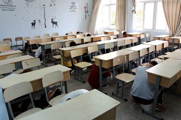 下午2:30分,现场指挥通过广播发出:“发生地震,立即进行避险”的指令,随着“地震”警报信号长鸣,教学楼各班老师立即停止授课,组织学生按照地震应急避险要求,迅速蹲下,蜷曲身体,降低身体重心,双手护头,就近躲在课桌下进行避震。